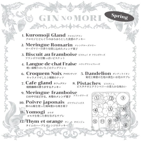 いちご、菊花、春山椒、ヨモギなどの春を感じる森の食材をつかった焼き菓子は全12種類。