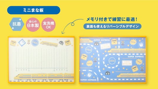 包丁の練習に最適なミニサイズのまな板で、表面には便利なメモリ付き。裏面にもドクターイエローのデザインが施されており、気分に合わせて両面お使いいただけます。