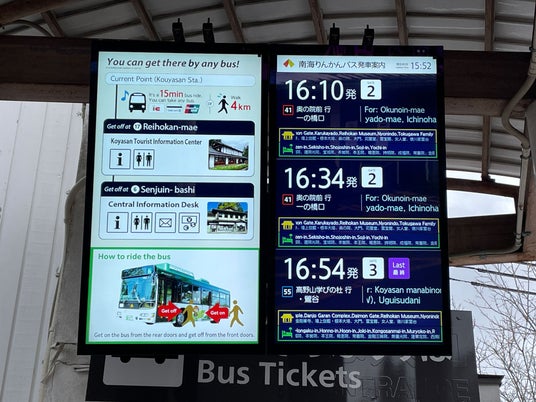 このような状況を改善するため、レイアウトや表示内容を自由に設定できるLECIP CMPを活用し、外国人観光客にも分かりやすい多言語対応の発着案内と、バスの乗車方法や運賃の支払い方法の動画などを表示しています。また日本語、英語、フランス語、スペイン語、ドイツ語での音声案内を行い、初めて高野山を訪れる観光客にとって、バスの利用がよりスムーズになることが期待されます。