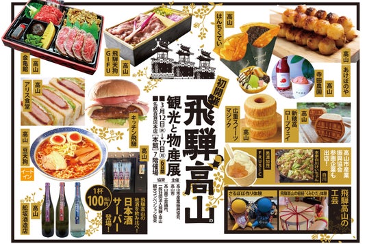飛騨高山が誇る「飛騨牛」のお弁当や串焼き、「みたらし団子」「高山ラーメン」などの名産品が大集結!伝統工芸品や体験イベントを通し、魅力溢れる飛騨高山を存分にお楽しみいただける物産展を初開催いたします!