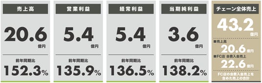 11店舗を新規出店し、売上高は20.6億円(前年同期比:152.3%)、売上高の伸長により、営業利益は5.4億円(前年同期比:135.9%)、経常利益は5.4億円(前年同期比:136.5%)、当期純利益は3.6億円(前年同期比:138.2%)を計上しました。
