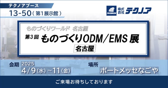 テクノアが出展する「第3回 ものづくりODM/EMS展 [名古屋]」 は、ものづくりの開発・製造ODM、EMSなどを得意とする企業が一堂に集結する展示会です。