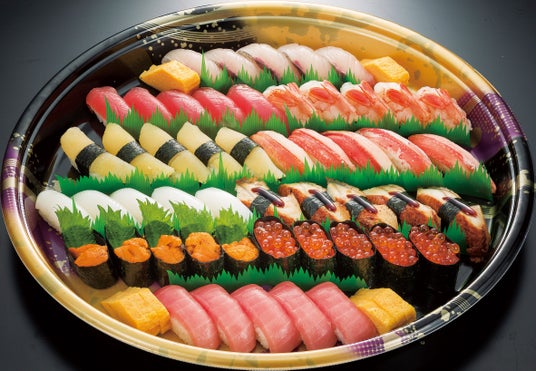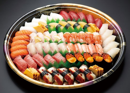 <いか・まぐろ・数の子・サーモン・のどぐろ・ぼたん海老・真鯛・かんぱち・かに・中とろ・うにいくら・うなぎ・飾り玉子>