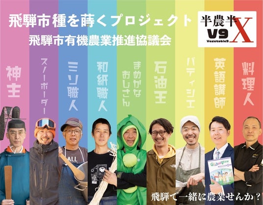 種を蒔くプロジェクトは、飛騨市の豊かな自然環境と受け継がれた農地を次世代に繋ぐため、飛騨市有機農業推進協議会(通称:V9)を中心に有機農業分野での人材育成や生産体制の構築に加え、販路拡大や認知度向上、地域の雰囲気づくりに向けた「種」を蒔き、それらを育てることで、将来にわたって環境にやさしいまちづくりを目指します。
