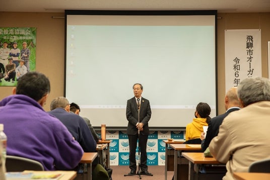 オーガニックビレッジ宣言に伴い、令和6年度活動報告会を実施しました。冒頭の市長挨拶では、有機農業とは、環境負荷低減や生産地の自然の恵みを背景とした顔の見える農業であると、有機農業推進の意義を語りました。また、東海農政局長による基調講演や飛騨市有機農業推進協議会メンバーによる活動報告・試食会が行われました。