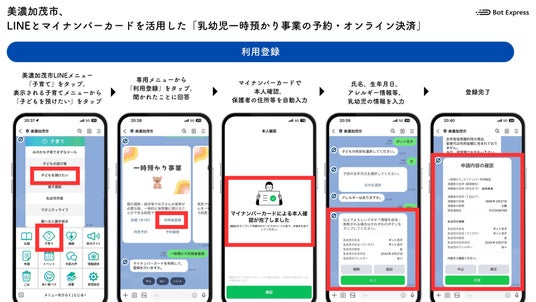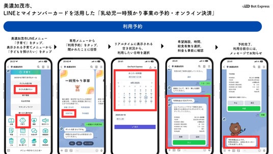 ほとんどの住民が、今、すぐに利用できるスマホ市役所「GovTech Express」を提供する株式会社Bot Express(本社:東京都 港区、代表取締役:中嶋 一樹、以下 Bot Express)は、岐阜県美濃加茂市(市長:藤井 浩人)がGovTech Expressを活用し、 美濃加茂市LINE公式アカウントから「乳幼児一時預かり事業の予約・オンライン決済」ができる行政サービスを、2025年4月1日 (火)より開始したことをお知らせいたします。