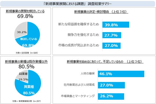 愛知県・三重県・岐阜県・滋賀県にある企業で1.経営者として働く20代~50代男女/2.経営企画に携わる20代~60代男女を対象に、「新規事業展開における課題」について調査しました。また、調査結果について当社コンサルタント2名が解説します。主な調査結果は以下の通りです。