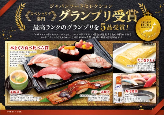 「にぎりの徳兵衛」「海鮮アトム」で提供する「本まぐろ食べ比べ六貫」「茶碗蒸し」「だし巻き玉子」などが、一般社団法人フードアナリスト協会主催「ジャパン・フード・セレクション(スペシャリテ部門)」にて最高ランクのグランプリを受賞いたしました。