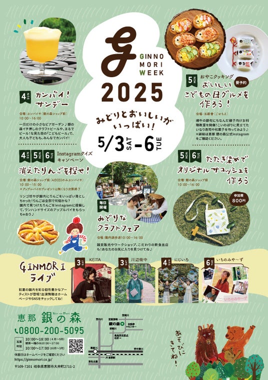 この度、株式会社銀の森コーポレーション(本社:岐阜県恵那市/代表取締役社長:渡邉好作)が運営いたします、食と自然の複合施設「恵那 銀の森(以下 銀の森)」にて、2025年5月3日~5月6日の4日間、ゴールデンウィークイベント「GINNOMORI WEEK2025」を開催することをお知らせいたします。期間中は自然を感じるワークショップなどのイベントや限定商品を多数ご用意。さらにクラフト作家さんが集まるマルシェや、生演奏やシャボン玉アート等のステージイベントなどが初夏の銀の森を盛り上げます。新緑の芽吹きがまぶしい季節、何かを始めてみたくなるようなワクワクした気持ちを形にする、そんなイベントを目指します。
