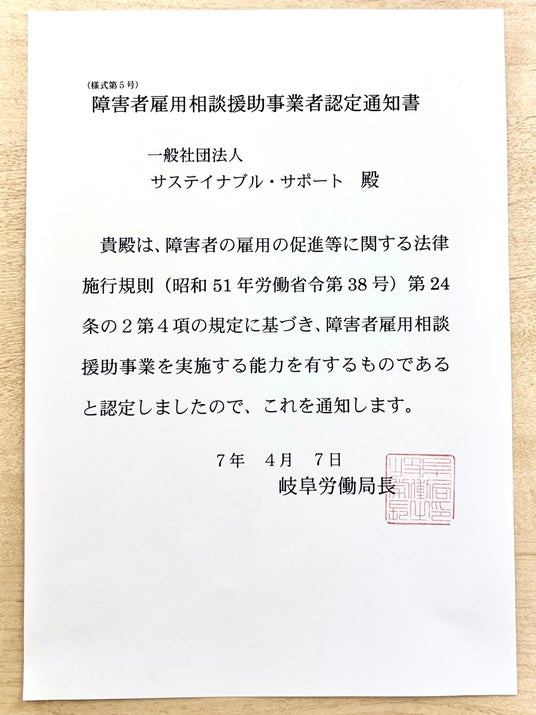 一般社団法人サステイナブル・サポート(所在地:岐阜県岐阜市、代表理事:後藤千絵)は令和7年4月7日、岐阜県内の事業所として初めて厚生労働省が定める「障害者雇用相談援助事業者」に認定されました。