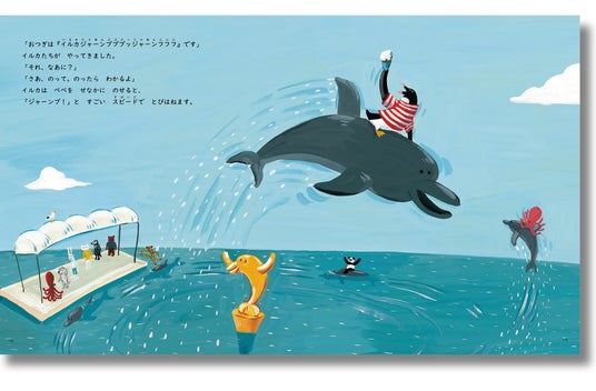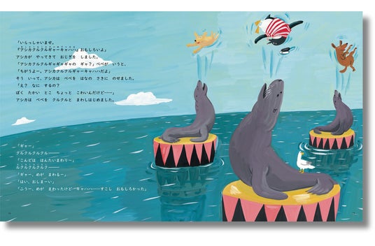 「アシカクルクルギャーキャハハハ」など、ゆかいな擬音擬態語(オノマトペ)がたくさん出てきて、おはなし会や読み聞かせにぴったりです。言葉の発達にも最適。そして、絵をよく見ると思いがけないキャラクターが!? 子どもとの会話が増えるしかけがたくさんつまっています。