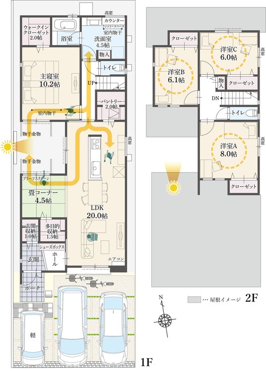 ポイント1. 1階に主寝室を配置、2階バルコニーの代わりに中庭を配して洗濯動線も集約