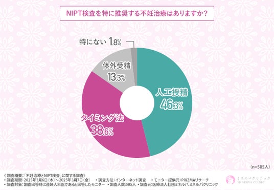 はじめに、「NIPT検査を特に推奨する不妊治療はありますか?」と質問したところ、『人工授精(46.3%)』と回答した方が最も多く、次いで『タイミング法(38.6%)』『体外受精(13.3%)』となりました。