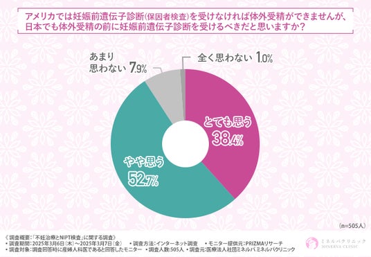 「アメリカでは妊娠前遺伝子診断(保因者検査)を受けなければ体外受精ができませんが、日本でも体外受精の前に妊娠前遺伝子診断を受けるべきだと思いますか?」と質問したところ、9割以上の方が『とても思う(38.4%)』『やや思う(52.7%)』と回答しました。