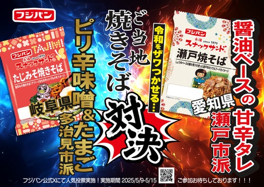フジパン株式会社(愛知県名古屋市)は、中部、北陸、静岡県の一部、限定商品として『スナックサンド たじみそ焼きそば』、『スナックサンド 瀬戸焼そば』を2025年5月1日(木)より2ヶ月間限定で販売いたします。