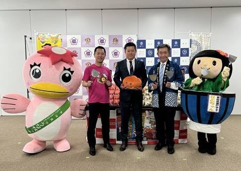 左から多治見高木市長、フジパン西春工場長山下、瀬戸川本市長
