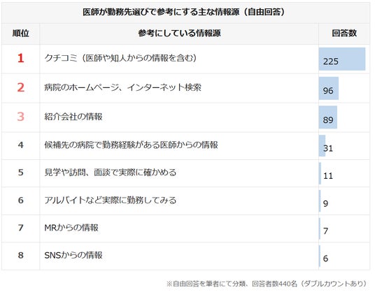 今回の調査では、医師の3分の2以上が病院を選ぶ際に「クチコミを参考にする」と回答しています。クチコミの中でもインターネットより知人・同僚医師の声を信頼する傾向が強く、クチコミの信ぴょう性への疑問や自ら実情を確認する必要性も指摘されました。
