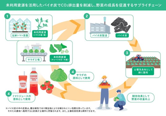 カゴメ株式会社(本社:愛知県名古屋市、代表取締役社長:山口 聡、以下カゴメ)とキユーピー株式会社(本社:東京都渋谷区、代表取締役 社長執行役員:高宮 満、以下キユーピー)は、未利用野菜資源をバイオ炭※1化する取り組みについて共同研究を開始します。本研究は、野菜に関わる事業に注力する両社が協力して、野菜の栽培・加工に関するサステナビリティ課題を解決することを目指し、持続可能な農業の実現に貢献する取り組みです。