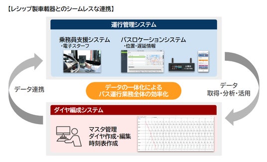 「ダイヤ編成システム」は、路線・系統・車両・乗務員の1日の業務計画などをもとに、路線バスダイヤを効率的に編成することができるシステムです。システムと運行管理システムを連携することで、より迅速で効率性の高いバスダイヤを編成するとともに、データの一体化によるバス運行業務全体の効率化を実現します。本システムを利用して作成したダイヤデータは、レシップ製の機器(運行支援システム、バスロケなど)へスムーズに連携することができるため、ダイヤ改正の度に発生する更新負担を軽減することができます。