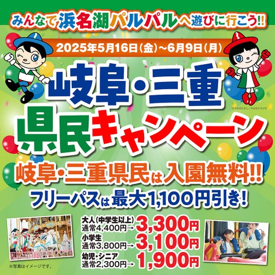 遠鉄観光開発株式会社(本社:浜松市中央区、社長:森下忠康)が運営する遊園地「浜名湖パルパル」(所在地:浜松市中央区舘山寺町1891)では、「岐阜・三重県民キャンペーン 5月6月連続開催!岐阜・三重県民は入園無料・フリーパスも特別価格」を実施いたします。