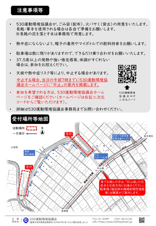 天候や熱中症リスクなどで中止する場合は、当日の午前7時までに530運動環境協議会のホームページに「中止」の案内を掲載します。