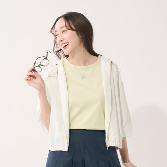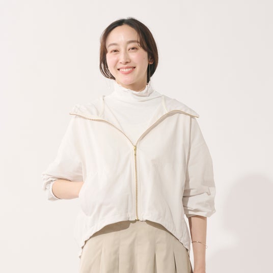 「UVシアーブルゾン」は、レンチング社のモダール繊維と初のソマルティ素材を使用し、紫外線カットできる素材を実現。身頃はゆったりとし、着丈はコンパクトに仕上げ様々なボトムスと好相性。裾のゴムギャザーは調整不要で着るだけで女性らしいシルエットが叶います。