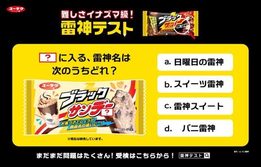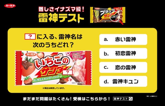 有楽製菓株式会社(本社:東京都小平市、代表取締役社長:河合辰信)が展開するチョコレート菓子「ブラックサンダー」は、中間テストの時期に合わせて、ブラックサンダーやシリーズ商品に記載されている「雷神名」を答える『ブラックサンダー雷神テスト』を2025年5月12日(月)より特設サイトで公開します。「ブラックサンダー雷神テスト」特設サイト: