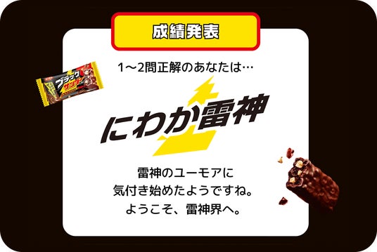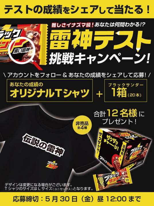 5月と言えばテストの時期。『ブラックサンダー雷神テスト』では、ブラックサンダーやシリーズ商品に記載されている「雷神名」を4つの選択肢から選ぶ形式で回答いただきます。全30問の中からランダムで5問出題され、正解数に応じた成績が4段階で表示されます。また、テスト結果をシェアすると各成績に応じた雷神名が付いたオリジナルTシャツが当たるXキャンペーンにご参加いただけます。