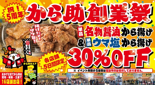 から助全16店舗を期間ごとに分けて、対象店舗にて「名物醤油から揚げ(単品)」「ウマ塩から揚げ(単品)」を30%オフでご提供。詳細な日程は以下をご覧ください。