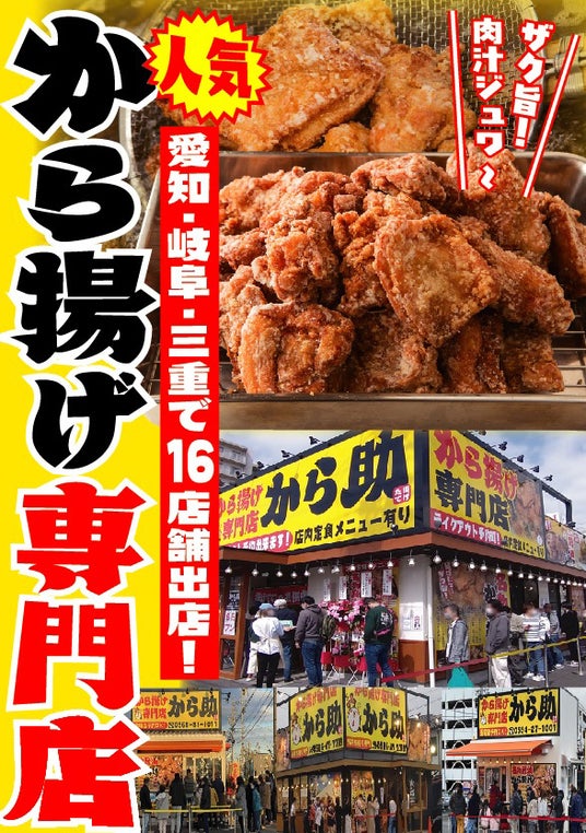 『から揚げ専門店 から助』は、『ザク旨』『肉汁ジュワ~』な揚げたてのジャンボ唐揚げをご提供するから揚げ専門店。愛知県・岐阜県・三重県に計16店舗を展開し、から揚げの月間販売個数は51万個を超える人気で、各店舗で連日多くのお客様にご好評をいただいております。