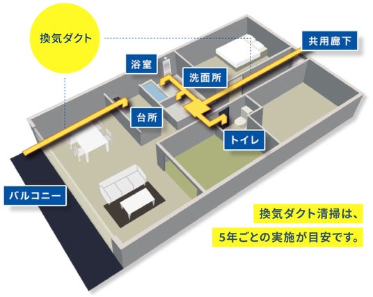 5月は気温・湿度が上昇し始め、空気のこもり・湿気・カビ・においといった住宅トラブルが起きやすくなる季節。中でも、ホコリや油汚れが溜まりやすい換気ダクトのメンテナンスは、梅雨前の今こそが最適です。また、冬~春にかけて使用頻度が高かった暖房や調理による油分がダクト内に残っている場合、換気効率が落ち、カビの温床になっている可能性もあります。