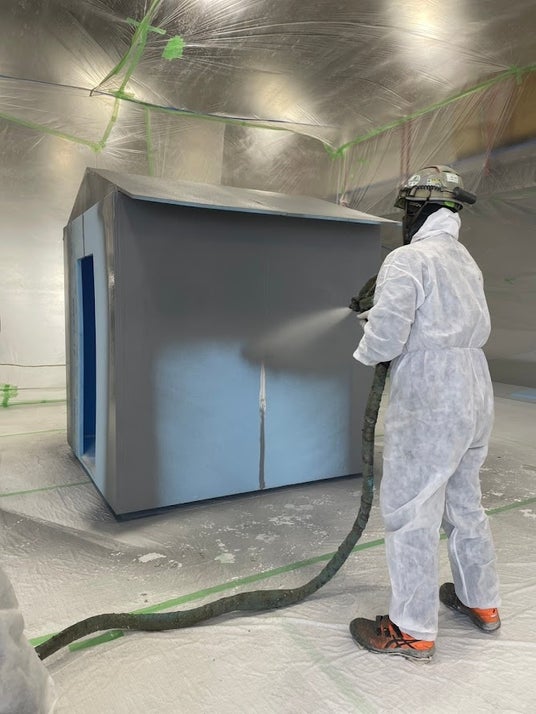 2025年2月には、災害時など迅速な対応が求められる場面を想定し、発泡スチロール製の各パーツに『レッドコートUS』を吹き付けて硬化させ、大人約8人が入ることができる簡易ハウスを組み立てる実験会を実施しました。