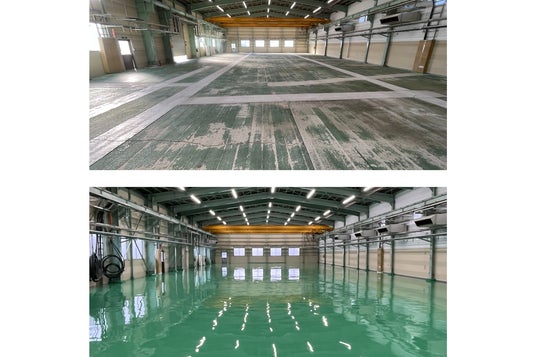 保有する下地処理用機械は、塗床業界全国最多(2024年6月現在、ライナックス調べ)。剥離が起こりやすい端部や油の染みたコンクリートの表層を除去し、塗膜の密着性を最大化することで、安全で長持ちする床を提供しています。(下記写真は施工前と施工後)