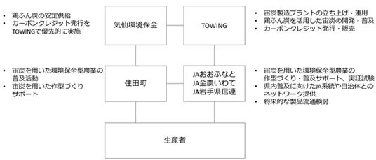 株式会社TOWING(代表取締役CEO:西田 宏平、以下「TOWING」)と、住田町(住田町長:神田 謙一、以下「住田町」)、有限会社気仙環境保全(代表取締役:大和田 国弘、以下「気仙環境保全」)、大船渡市農業協同組合(代表理事組合長:猪股 岩夫、以下「JAおおふなと」)、全国農業協同組合連合会岩手県本部(県本部長:高橋 司、以下「JA全農いわて」)、岩手県信用農業協同組合連合会(代表理事理事長:荒木田 裕樹、以下「JA岩手県信連」)は、TOWINGが岩手県気仙郡住田町で開発・製造する高機能バイオ炭「宙炭(そらたん)」を活用し、岩手県内の農業における諸所の課題解決、並びにみどりの食料システム戦略の現場実装を目的とし、包括的連携にかかる協定(以下「本協定」)を締結いたしました。