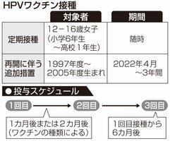 厚生労働省は22年4月から接種の積極的な勧奨を再開すると決定しました。しかも、接種の積極的な勧奨が控えられていた8年余りの期間に、接種機会を逃した世代(1997~2005年度生まれ)の女性に対しても、22年4月から3年間は公費で接種できる機会を設ける方向となりました=表=。