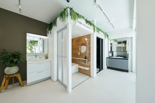 最新のユニットバス、キッチン、洗面化粧台、トイレなどの一流メーカーでセットアップした4点セットが税込99.9万でリフォームできるなど、物価高騰のなか、建設業歴50年以上のグループだから、お得で品質の高い施工ネットワークを活かし、西三河エリア新築住宅シェアNo.1の大量仕入れでボリュームディスカウントがかないます。さらにこだわるのがお得だけではなく、空間づくりです。新しいショールームも緑化が映えるように全体を無地のキャンパスのように白基調にして、グリーンと最新のキッチンやお風呂が美しく際立つ設計にしております。機能性のある水まわりだけではなく、全体の空間の世界観を大事にすることで、より住まい空間を人が感動・共鳴する琴線にふれる空間へと導きます。
