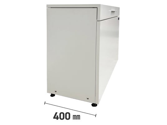 奥行400mmとスリムなため、ガレージや勝手口横など、スペースが限られた狭小地の設置にも最適です。ご家庭以外にも、店舗のバックヤードなどにも設置頂けます。材質は耐食性に優れたスチール製です。