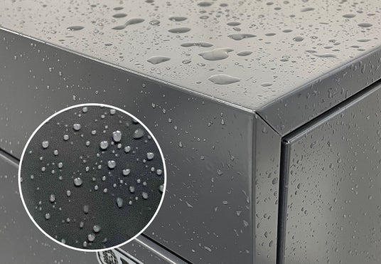 左右の側板、後板に立ち上がりを追加し、防滴仕様を実現。IPX4という水の浸水に対する保護等級で、屋外設置しても雨水等が入りにくい構造。屋外に置いた場合でも、中身をガードします。