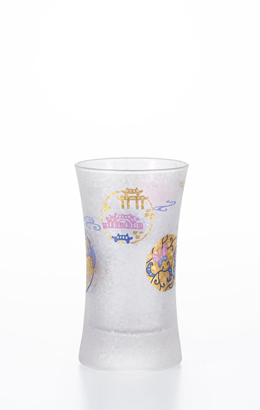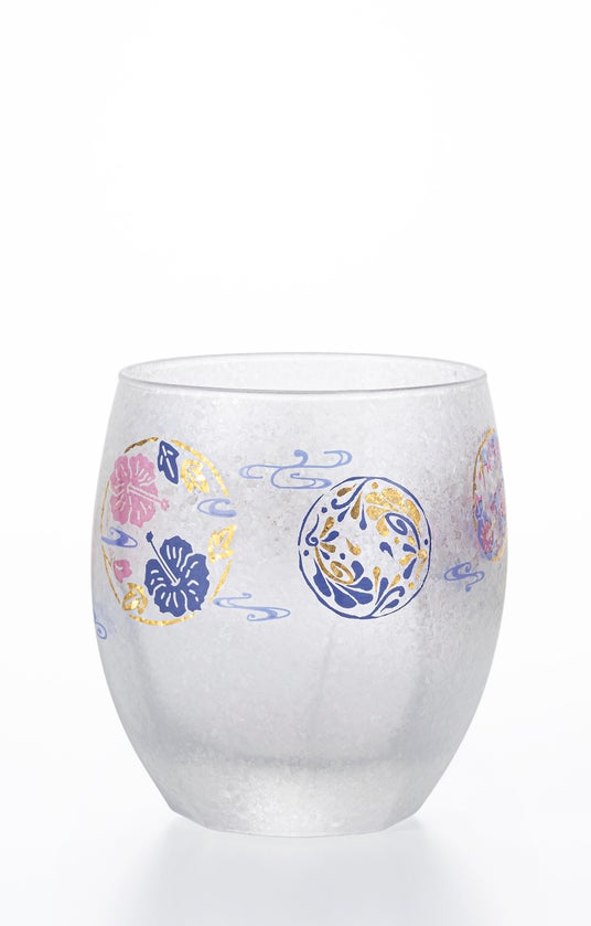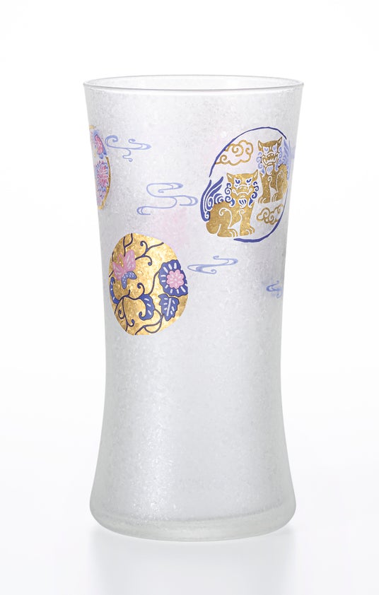 このたび第一弾として、豊かな自然と独自の文化が息づく沖縄編が登場。 沖縄を象徴する6つのモチーフ(紅型〈びんがた〉2柄、やちむん唐草、シーサー、ハイビスカス、首里城)を、縁起の良い丸紋として表現し、涼しげなみぞれ加工を施したグラスにデザインしました。きらめく沖縄のような見た目の美しさだけでなく、手に取ったときの心地よい質感もお楽しみいただけます。