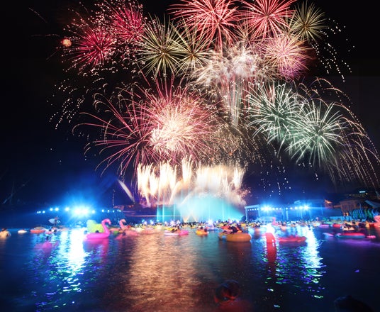 花火スペクタキュラ「FLAME(フレイム)」ナイトプールに入りながら楽しめる花火ショーです。夜空を彩る壮大な花火、テクノとロックが融合したサウンド、そして今年、さらに派手にパワーアップした照明・噴水・レーザーなどのショーエフェクトのコラボレーションをお楽しみいただけます。