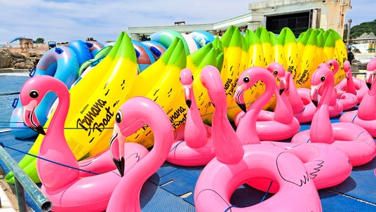 浮き輪フリーパス種類豊富な浮き輪をレンタルします。行き帰りに持ち運ぶ手間や準備や片付けがなくなります。ナイトプールでは写真映えする浮き輪もご用意しております。