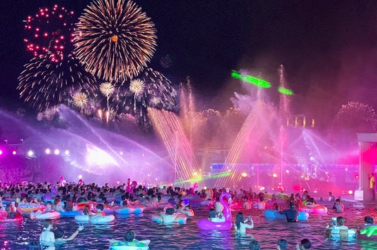 打上花火「スプラッシュGIGA MAX」ナイトプール仕様の打上花火です。噴水や照明、レーザーなどのショーエフェクトなどの演出も加わり、<水しぶき>や<様々な光の演出>を浴びながら、打上花火を楽しめます。