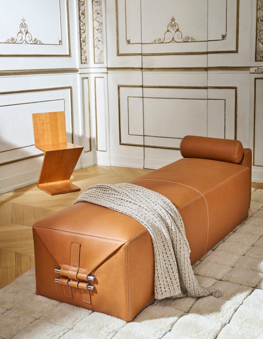 3つのオットマン(正方形2種/長方形1種)とアームチェアから成る機能的なこれらのモデルは、馬具や革細工の世界からインスピレーションを得ています。バッグやスーツケース、包装紙に包まれたギフトなど、さまざまなものを連想させる非常に洗練された職人技による包み方が特徴で、メタルパーツで装飾されています。居心地の良いアームチェアは、手編みの天然サドルレザーを使用した背もたれが職人技を感じさせ、より快適で理想的なくつろぎを提供するデザインです。
