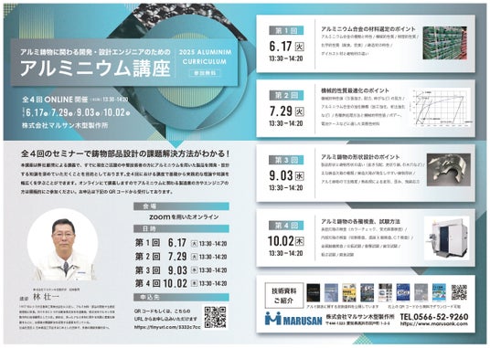 砂型アルミ鋳造を専門とする株式会社マルサン木型製作所(本社:愛知県碧南市)は、アルミニウムを扱う開発・設計エンジニアを対象とした全4回の無料オンラインセミナーを、2025年6月17日(火)より開催いたします。