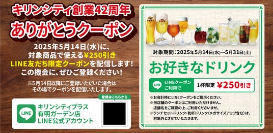 ビアレストラン キリンシティは、1983年5月14日に創業し、今年で創業42周年を迎えます。ご愛顧いただいているお客様への感謝の気持ちを込めて、お好きなドリンクが250円引き(1杯限定)になるクーポンを5月14日(水)に配信いたします。