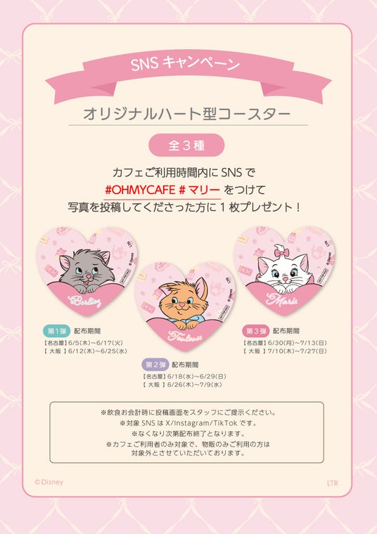 ■SNSキャンペーン:XまたはInstagramまたはTikTokでカフェ店内もしくは飲食メニュー写真に「#OHMYCAFE」、「#マリー」をつけて投稿していただいた方に先着で「オリジナルハート型コースター(全3種)」をお1人様につき1つプレゼント! ※無くなり次第終了。