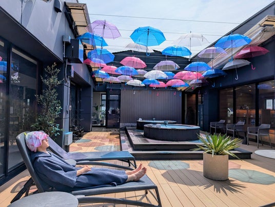 ・外気浴エリアにて、あじさいをイメージしたアンブレラスカイの装飾