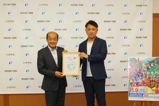 委嘱式では、揖斐川町の岡部栄一町長から当社の取締役副社長・中森勇樹が「いびがわマラソン2025の公式アンバサダー」の委嘱状を受け取りました。