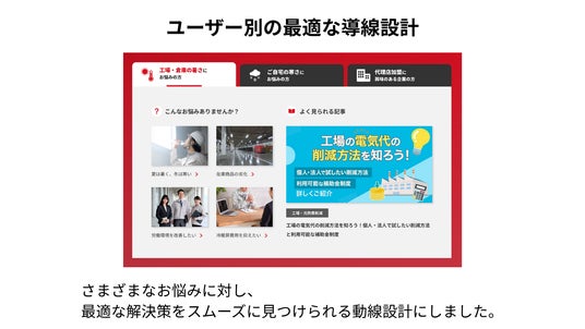 1.ユーザー別の最適な導線設計解決策を探すための入口を「工場・倉庫の暑さにお悩みの方」「ご自宅の寒さにお悩みの方」「代理店加盟に興味のある企業の方」と明確に分類。それぞれの入口から、関連する情報へとスムーズに誘導する設計を実現しました。