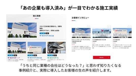 導入実績を前面に打ち出したレイアウトに刷新しました。「うちと同じ業種の会社はどうなった?」と思わず知りたくなる事例紹介と、実際に導入したお客様の生の声を紹介します。「室温36度から、サーモバリア施工後には28度に」「以前よりも、空調の効きがよくなった」など、具体的な成果が手に取るように伝わる構成で、訪問者の興味を引き立てます。